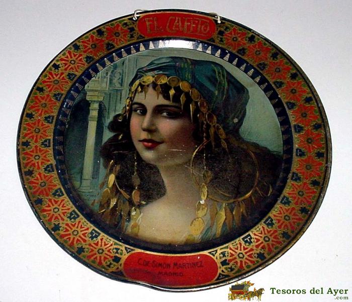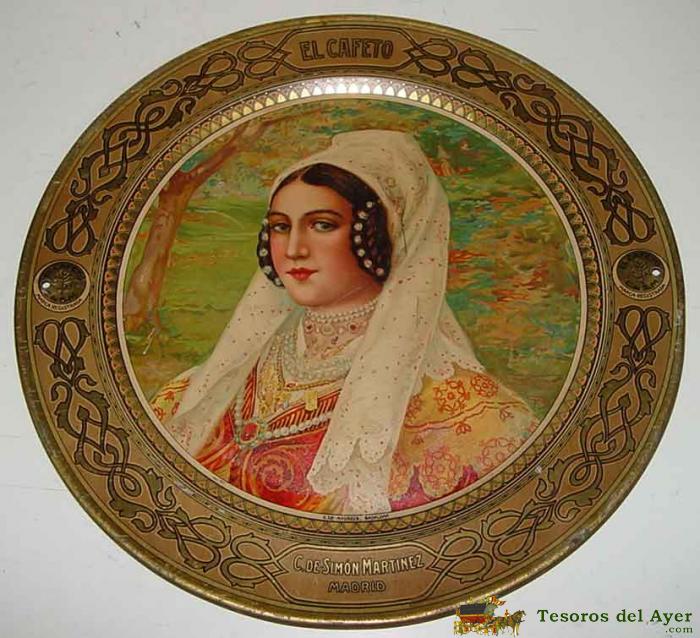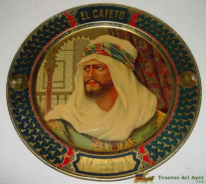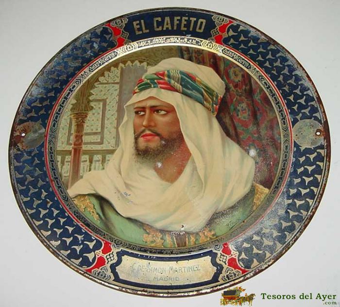 ANTIGUO PLATO DE HOJALATA LITOGRAFIADA CON PUBLICIDAD DE EL CAFETO, MIDE 38 CMS. DE DIAMETRO - TAL COMO SE VE EN LAS FOTOS - LITOGRAFIA DE ANDREIS DE BADALONA