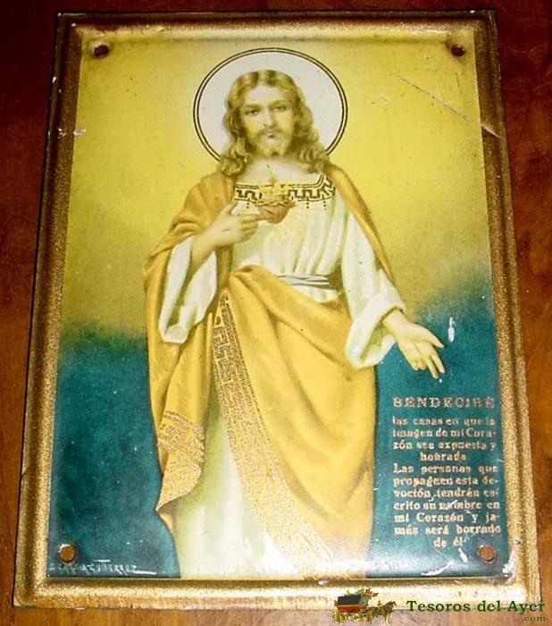 ANTIGUA CHAPA LITOGRAFIADA BENDECIRE, SAGRADO CORAZON DE JESUS, FIRMADA POR J. GARCIA GUTIERREZ, MIDE 15 X 11,3 CMS.