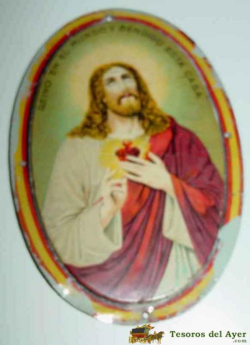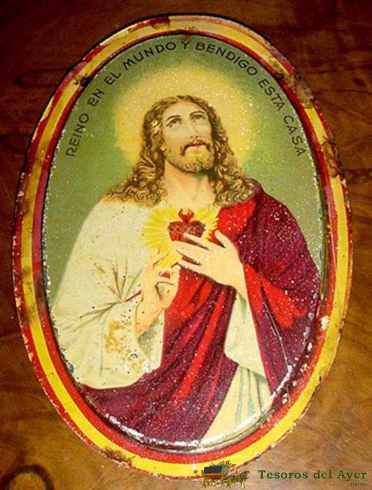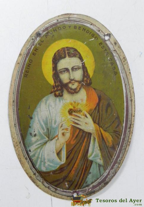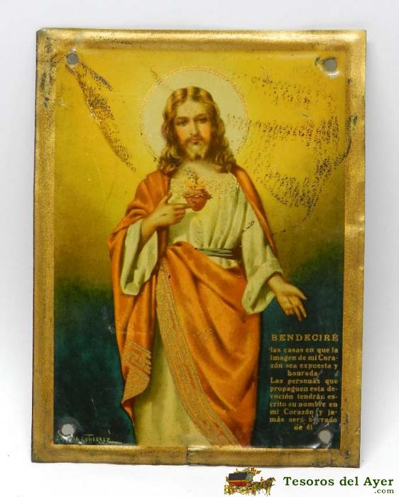 ANTIGUA CHAPA DE HOJALATA LITOGRAFIADA DE EL SAGRADO CORAZON DE JESUS - MIDE 14,5 X 9,5 CMS. SE PONIAN EN LA PUERTA DE LAS CASAS A FIN DE BENDECIRLAS DESPUES DE LA GUERRA CIVIL, VER LA OTRA FOTO CON LA PARTE TRASERA, CON PUBLICIDAD DEL REGIMEN. BARRENECHE