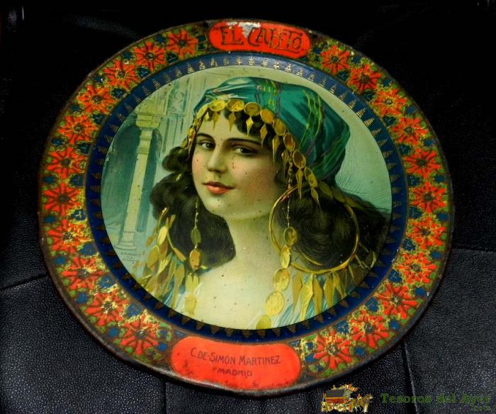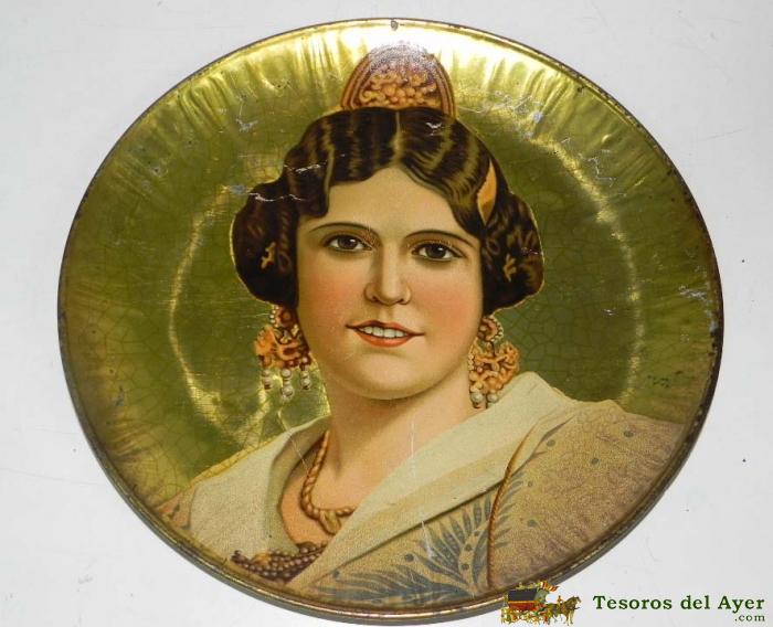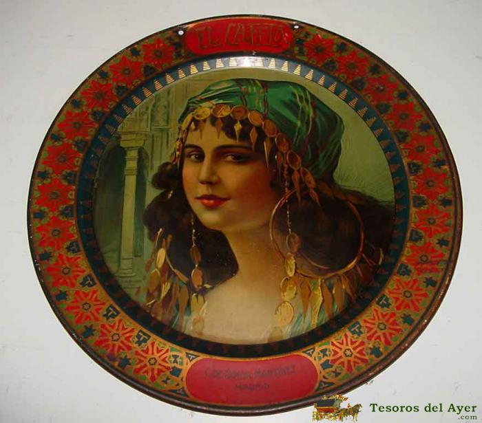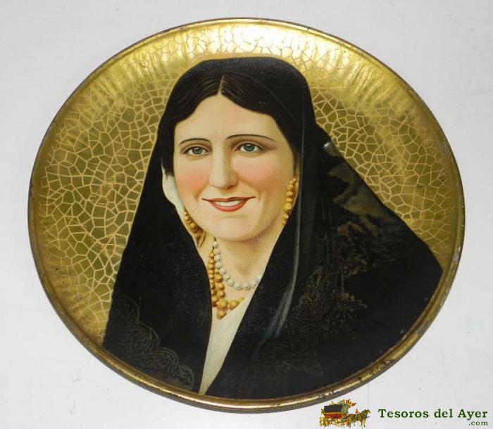 ANTIGUO PLATO GRANDE DE HOJALATA LITOGRAFIADA CON BUSTO DE VALENCIANA, SOCIETE GENERALE DES CIRAGES FRANCAIS, SANTANDER, MUY GRANDE 40 CMS. DE DIAMETRO, TAL COMO SE VE EN LAS FOTOGRAFIAS PUESTAS.