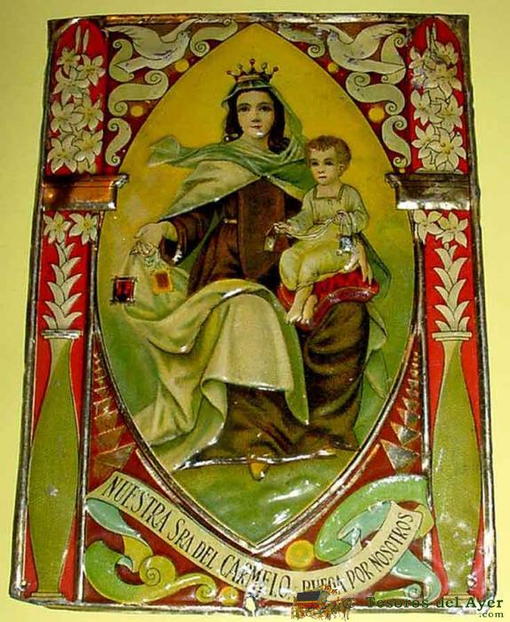 ANTIGUA CHAPA DE HOJALATA LITOGRAFIADA DE NUESTRA SEÑORA DEL CARMELO CON PUBLICIDAD DE SERVUS Y KAOL PARA LIMPIAR METALES - SE PONIA EN LA PUERTA DE LAS CASAS - MIDE 13,8 X 10,2 CMS. BUEN ESTADO DE CONSERVACION