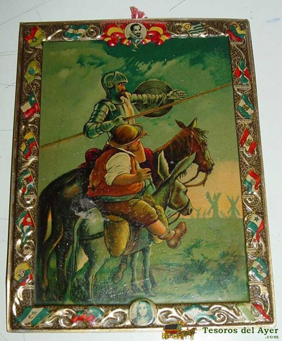 ANTIGUA CHAPA DE HOJALATA LITOGRAFIADA DEL QUIJOTE, CERVANTES, CRISTOBAL COLON - CON PUBLICIDAD DE PRODUCTOS SERVUS, KAOL - BADALONA - FIRMAD EN LA PARTE INFERIOR POR A. MESTRE - AÑO 1929 - GRAN TAMAÑO, MIDE 47,5 X 35 CMS - ESTA PEGADA SOBRE UNA MADERA D