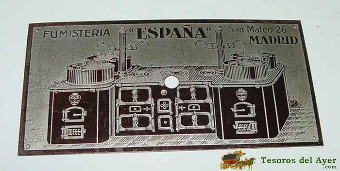 ANTIGUA CHAPA METALICA LITOGRAFIADA - CON PUBLICIDAD DE FUMISTERIA ESPAÑA - SAN MATEO 26 - MADRID - MIDE 14 X 7 CMS.