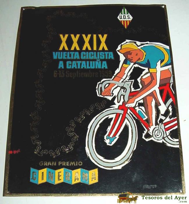 ANTIGUA CHAPA DE LATON ESMALTADA CON PUBLICIDAD DE LA XXXIX VUELTA CICLISTA A CATALUÑA - 1959 - GRAN PREMIO CINERAMA - MIDE 20 X 15 CMS - EXCELENTE ESTADO DE CONSERVACION.