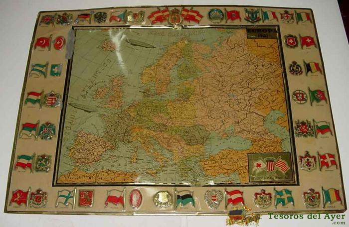 ANTIGUA CHAPA DE HOJALATA LITOGRAFIADA CON PUBLICIDAD DE SERVUS Y KAOL - MAPA DE EUROPA - BUEN ESTADO -MIDE 67 X 49 CMS - AÑO 1931.