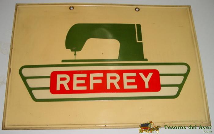 ANTIGUA CHAPA LITOGRAFIADA CON PUBLICIDAD DE LA FIRMA REFREY - MAQUINAS DE COSER - LA MáQUINA Y LOS CARACTERES ESTAN EN RELIEVE - MIDE 69 X 48 CM. - G. DE ANDREIS BADALONA.