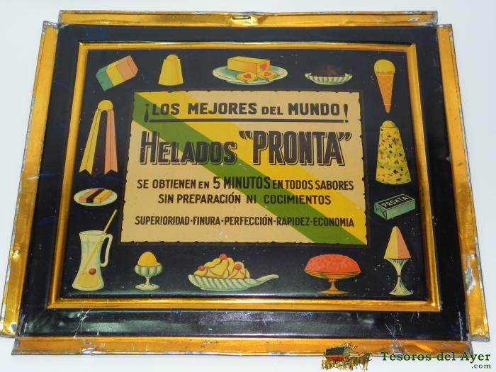 ANTIGUA CHAPA DE HOJALATA LITOGRAFIADA CON PUBLICIDAD DE HELADOS PRONTA, NO VIENE EL FABRICANTE DE LA LITOGRAFIA - MIDE 37 X 32 CMS., TAL Y COMO SE VE EN LAS FOTOGRAFIAS.