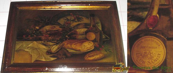 ANTIGUA CHAPA LITOGRAFIADA DE PUBLICIDAD DE LICOR SAMELY, ESTOMACAL E HIGIENICO - JOSE CARULLA SABATES, LERIDA, AUTOR F. CAMINS, MIDE 68 X 48 CMS. FABRICADO POR G. ANDREIS DE BADALONA, CHAPA LISA CON MARCO EN RELIEVE, DESTILERIAS, LICORES, VINOS, BODEGA,