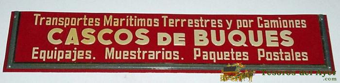ANTIGUA CHAPA DE HOJALATA LITOGRAFIADA AÑOS 40 TRANSPORTES MARITIMOS TERRESTRES Y POR CAMIONES, CASCOS DE BUQUES, EQUIPAJES, MUESTRARIOS, PAQUETES POSTALES, NUEVA CASI A ESTRENAR, MIDE 49 X 10 CM.