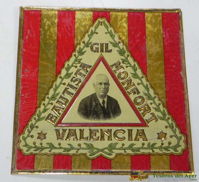 ANTIGUA CHAPA METALICA PUBLICITARIA DE BAUTISTA GIL MONFORT, VALENCIA, ORLA PARECIDA A LAS DE LA MASONERIA, CON FONDO BANDERA VALENCIANA, BUEN ESTADO DE CONSERVACION, REALIZADA POR JOSE SOLER DE VALENCIA, MIDE 16,5 X 16,5 CMS.