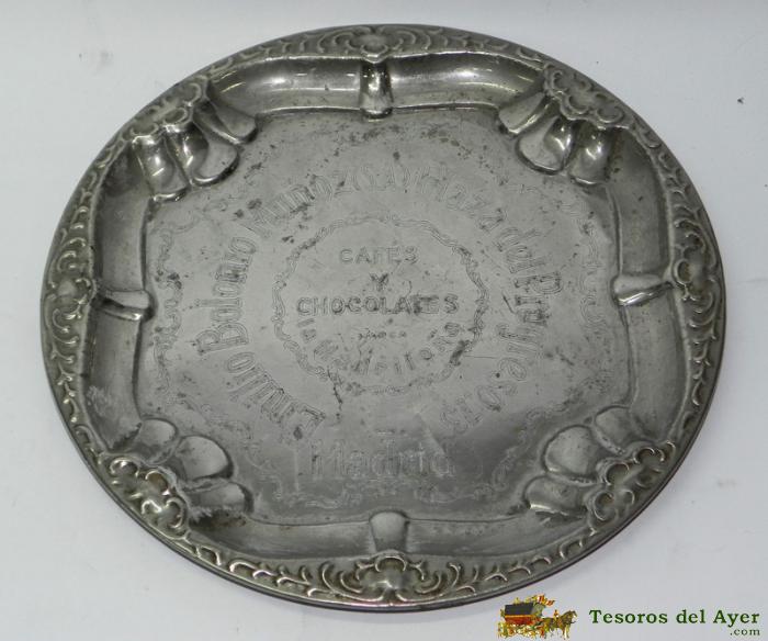 ANTIGUA BANDEJA METALICA CON PUBLICIDAD DE CAFES Y CHOCOLATES MARCA LA MADRILEÑA, EMILO BOLONIO MUÑOZ, PLAZA DEL PROGRESO, 13 DE MADRID, MIDE 25 CMS. DE DIAMETRO. FINALES SIGLO XIX PRINCIPIOS DEL XX.