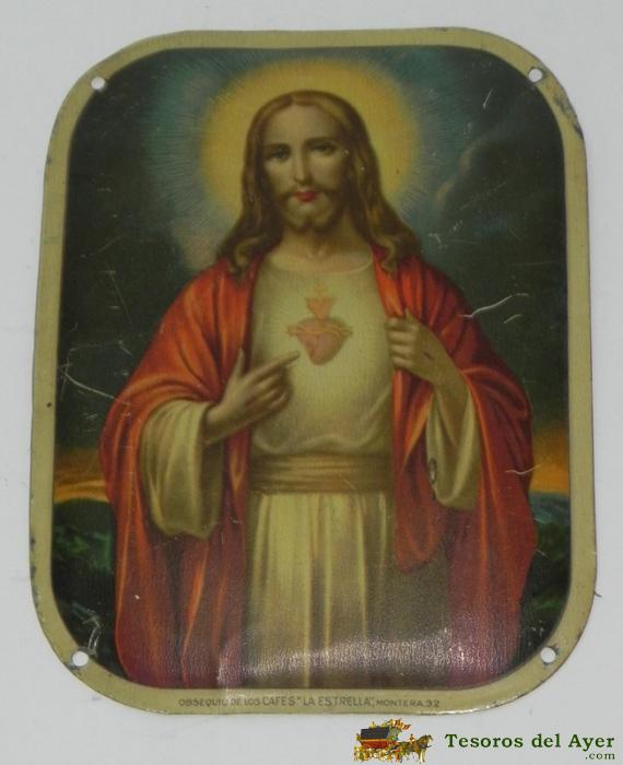 ANTIGUA CHAPA RELIGIOSA DEL SAGRADO CORAZON DE JESUS, RELIGIOSA CON PUBLICIDAD DE CAFES LA ESTRELLA, SE PONIA EN LAS PUERTAS.
