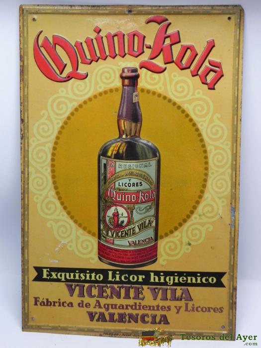 CHAPA LITOGRAFIADA DE HOJALATA CON PUBLICIDAD DE QUINO KOLA, VICENTE VILA, VALENCIA, FABRICADA POR PRAGER & LOJDA - BERLIN, MIDE 36 X 24 CM.