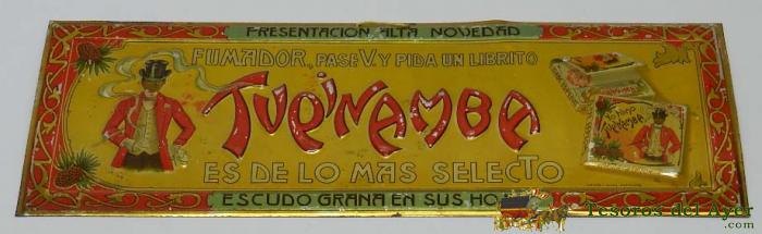 ANTIGUA CHAPA LITOGRAFIADA DE PUBLICIDAD DE PAPEL DE FUMAR TUPINAMBA. J.LAPORTA VALOR, ALCOY. MIDE 35 X 12CM. FABRICADA POR TINTORE Y OLLER, BUEN ESTADO