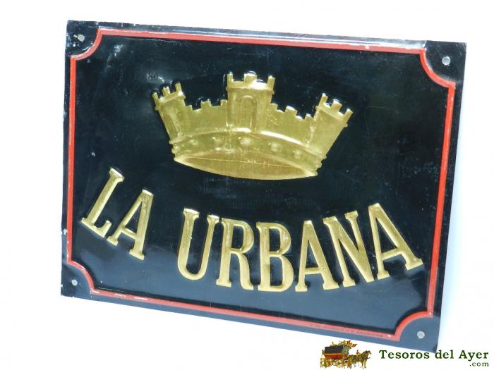 CHAPA O PLACA CARTEL EN RELIEVE DE SEGUROS LA URBANA, AÑOS 40, FABRICADA POR G. DE ANDREIS, BADALONA, MIDE 28,5 X 21 CMS.