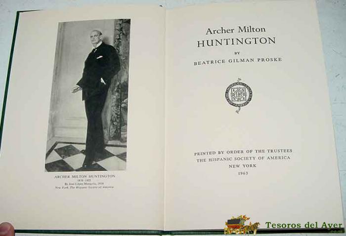 ANTIGUO LIBRO DE ARCHER MILTON HUNTINGTON - POR PROSKE, BEATRICE GILMANN - PRINTED BY ORDER OF THE TRUSTEES THE HISPANIC SOCIETY OF AMERICA - NEW YORK, 1963. 8º MAYOR. 4 HOJAS, 28 PáGINAS. LáMINAS FOTOGRáFICAS. TELA EDITORIAL. LIBRO HOMENAJE AL FUNDADOR D
