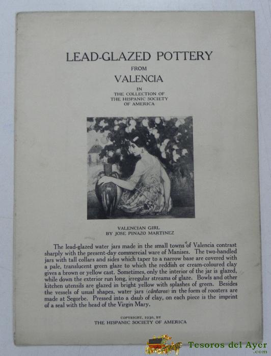 LEAD GLAZED POTTERY FROM VALENCIA IN THE COLLECTIN OF THE HISPANIC SOCIETY OF AMERICA WITH COMPARATIVE MATERIAL, 1930, 12 PAGINAS, SE DESPLIEGA EN CARTEL, CADA PAGINA MIDE 19 X 14 CMS. MUY ILUSTRADO, CERCAMICA, PORCELANA.