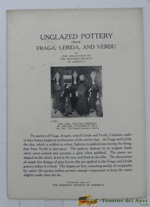 UNGLAZED POTTERY FROM FRAGA, LERIDA, AND VERDU IN THE COLLECTIN OF THE HISPANIC SOCIETY OF AMERICA WITH COMPARATIVE MATERIAL, 1930, 12 PAGINAS, SE DESPLIEGA EN CARTEL, CADA PAGINA MIDE 19 X 14 CMS. MUY ILUSTRADO, CERCAMICA, PORCELANA.