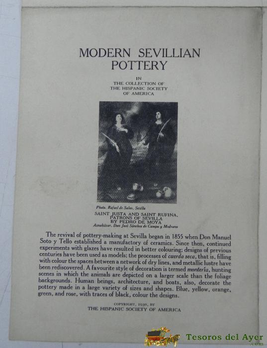 MODERN SEVILLIAN POTTERY IN THE COLLECTIN OF THE HISPANIC SOCIETY OF AMERICA WITH COMPARATIVE MATERIAL, 1930, 12 PAGINAS, SE DESPLIEGA EN CARTEL, CADA PAGINA MIDE 19 X 14 CMS. MUY ILUSTRADO, CERCAMICA, PORCELANA.