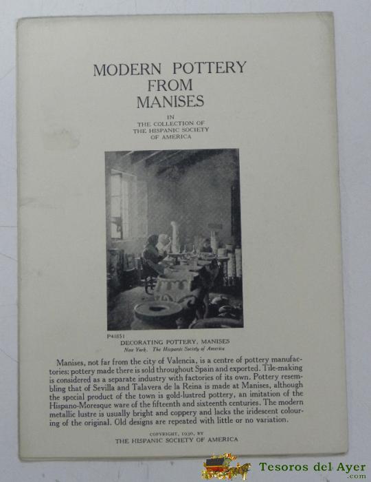 MODERN POTTERY FROM MANISES IN THE COLLECTIN OF THE HISPANIC SOCIETY OF AMERICA WITH COMPARATIVE MATERIAL, 1930, 12 PAGINAS, SE DESPLIEGA EN CARTEL, CADA PAGINA MIDE 19 X 14 CMS. MUY ILUSTRADO, CERCAMICA, PORCELANA.