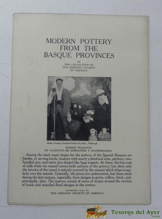 MODERN POTTERY FROM THE BASQUE PROVINCES IN THE COLLECTIN OF THE HISPANIC SOCIETY OF AMERICA WITH COMPARATIVE MATERIAL, 1930, 12 PAGINAS, SE DESPLIEGA EN CARTEL, CADA PAGINA MIDE 19 X 14 CMS. MUY ILUSTRADO, CERAMICA, PORCELANA.