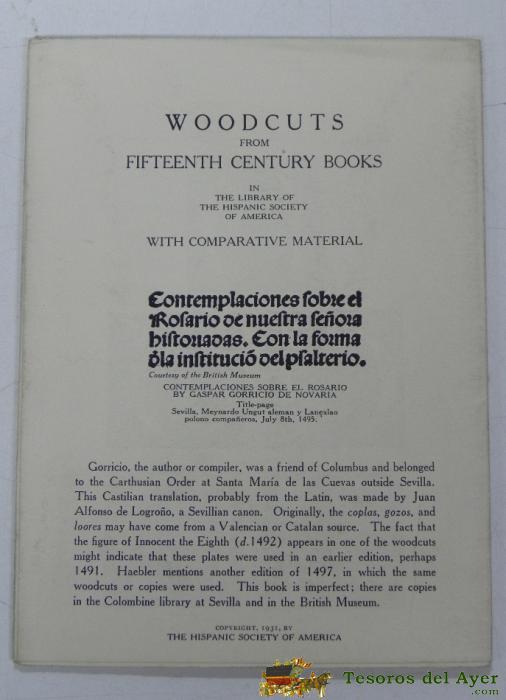 WOODCUTS FROM FIFTEENTH CENTURY BOOKS IN THE COLLECTIN OF THE HISPANIC SOCIETY OF AMERICA WITH COMPARATIVE MATERIAL, 1930, 24 PAGINAS, SE DESPLIEGA EN CARTEL, CADA PAGINA MIDE 19 X 14 CMS. MUY ILUSTRADO,