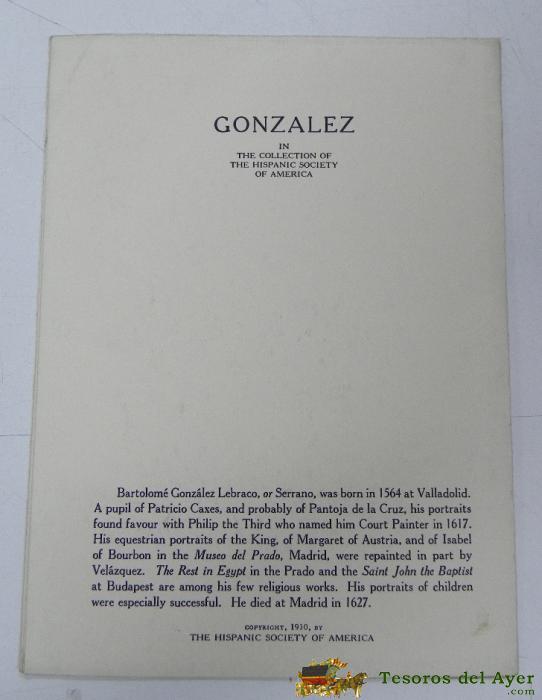 GONZALEZ (BARTOLOME GONZALEZ LEBRACO OR SERRANO) IN THE COLLECTIN OF THE HISPANIC SOCIETY OF AMERICA WITH COMPARATIVE MATERIAL, 1930, 6 HOJAS, SE DESPLIEGA EN CARTEL, CADA PAGINA MIDE 19 X 14 CMS. MUY ILUSTRADO,