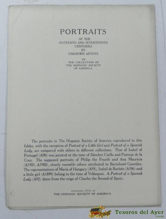 PORTRAITS OF THE SIXTEENTH AND SEVENTEENTH CENTURIES BY UNKNOWN ARTISTS IN THE COLLECTIN OF THE HISPANIC SOCIETY OF AMERICA WITH COMPARATIVE MATERIAL, 1930, 6 HOJAS, SE DESPLIEGA EN CARTEL, CADA PAGINA MIDE 19 X 14 CMS. MUY ILUSTRADO,