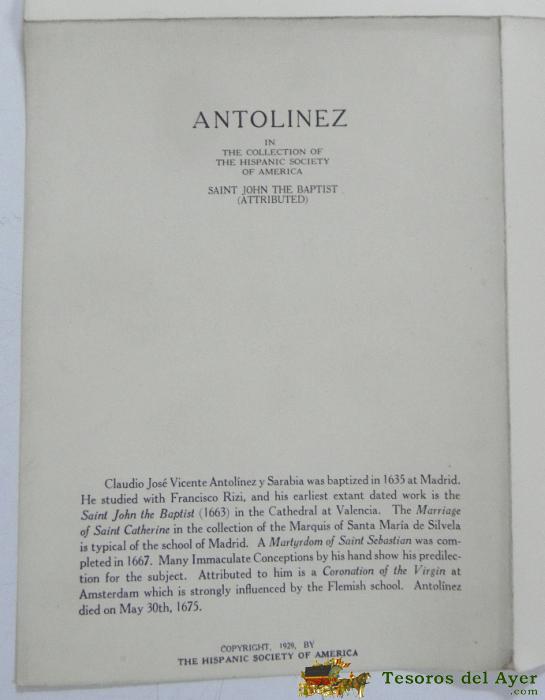 ANTOLINEZ (CLAUDIO JOSE VICENTE ANTOLINEZ Y SARABIA) IN THE COLLECTIN OF THE HISPANIC SOCIETY OF AMERICA WITH COMPARATIVE MATERIAL, 1929, 6 HOJAS, SE DESPLIEGA EN CARTEL, CADA PAGINA MIDE 19 X 14 CMS. MUY ILUSTRADO,
