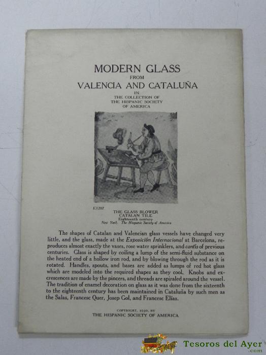 MODERN GLASS FROM VALENCIA AND CATALUÑA IN THE COLLECTIN OF THE HISPANIC SOCIETY OF AMERICA WITH COMPARATIVE MATERIAL, 1930, 6 HOJAS, SE DESPLIEGA EN CARTEL, CADA PAGINA MIDE 19 X 14 CMS. MUY ILUSTRADO,