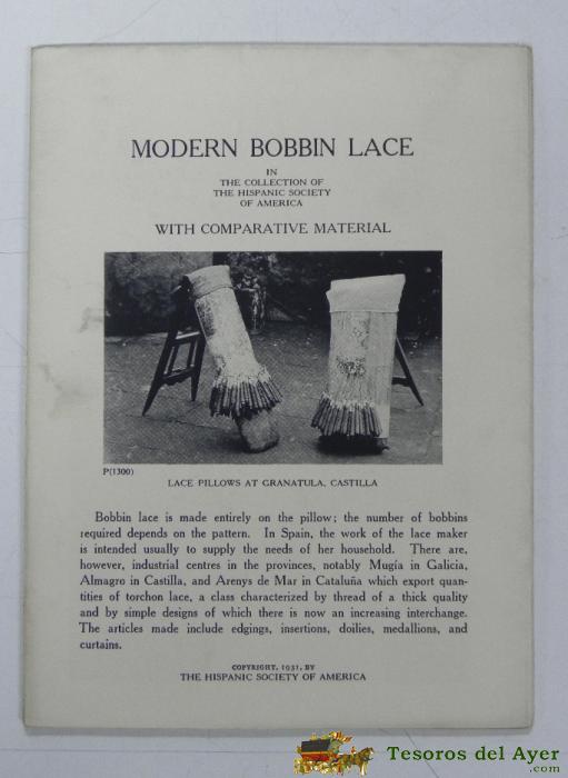 MODERN BOBIN LACE IN THE COLLECTIN OF THE HISPANIC SOCIETY OF AMERICA WITH COMPARATIVE MATERIAL, 1931, 12 HOJAS, SE DESPLIEGA EN CARTEL, CADA PAGINA MIDE 19 X 14 CMS. MUY ILUSTRADO,