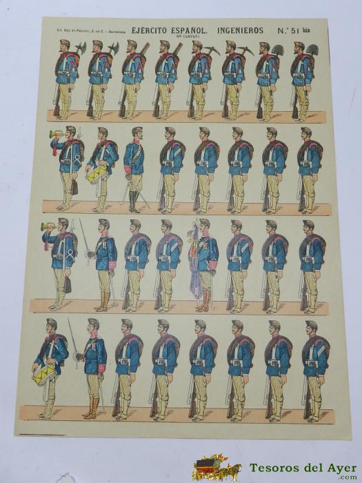 ANTIGUA LAMINA DE RECORTABLES PALUZIE Nº 51 BIS, EJERCITO ESPAÑOL INGENIEROS EN CAMPAÑA - ESTAMPERIA ECONOMICA, IMPRENTA ELZEVIRIANA Y LIBRERIA CAMI - MIDE 39 X 28 CMS.