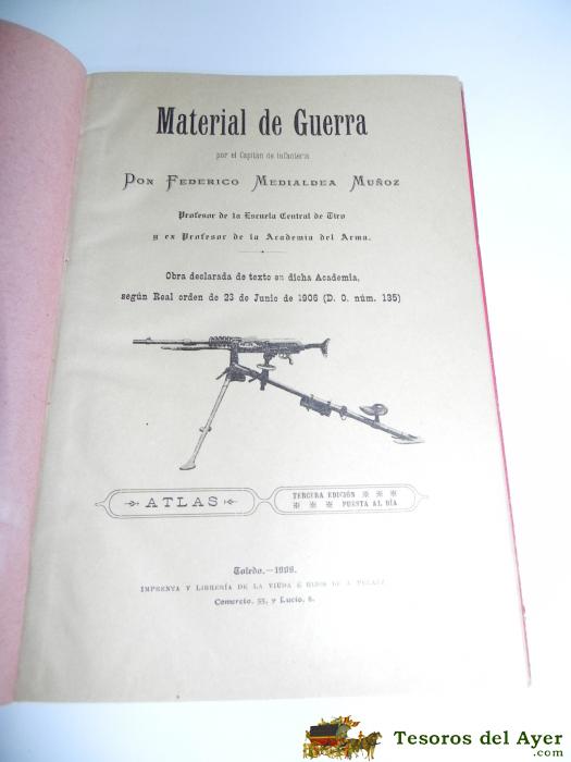 MEDIALDEA MUÑOZ, FEDERICO - MATERIAL DE GUERRA. ESTUDIO DESCRIPTIVO DEL REGLAMENTARIO EN ESPAÑA. ATLAS - TOLEDO, IMP. VDA. E HIJOS DE PELAEZ (1909) 1 TOMO. 40 LAMINAS A DOBLE PAGINA, DE AMETRALLADORAS, PISTOLAS, CAÑONES, CARRETONES, GLOBOS, VAGONES DE MER