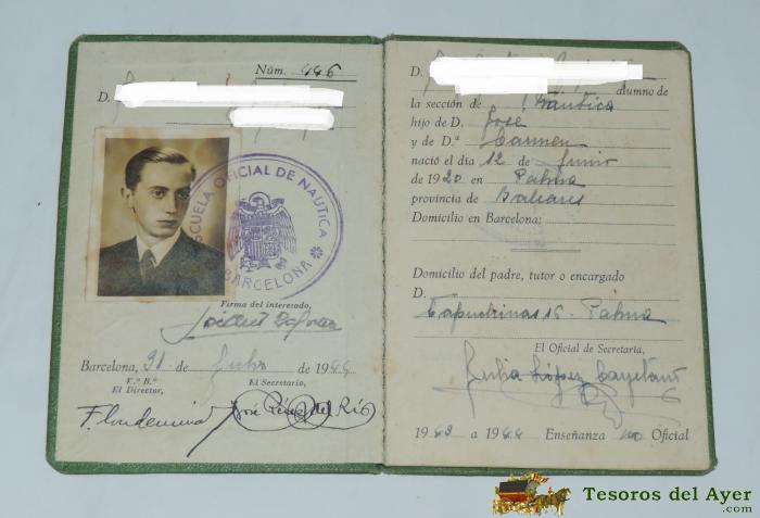 CARNET DE LA ESCUELA OFICIAL NAUTICA, BARCELONA. 1944. CARNET DE IDENTIDAD ESCOLAR. MIDE 12 X 8,5 CMS