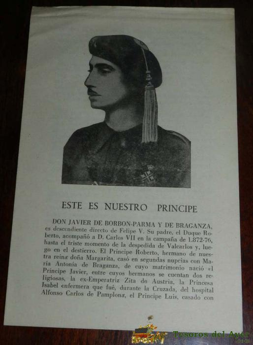 DIPTICO CARLISTA, ESTE ES NUESTRO PRINCIPE DON JAVIER DE BORBON-PARMA Y DE BRAGANZA, CARLISMO, SEGUN MANIFIESTO DE 25 DE JULIO DE 1941, MIDE ABIERTO 24,5 X 19 CMS.