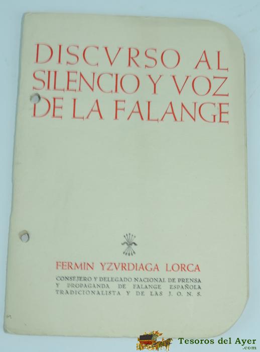 FERMíN YZURDIAGA LORCA. DISCURSO AL SILENCIO Y VOZ DE LA FALANGE. PRONUNCIADO EN VIGO, EN 1937. TIENE 48 PAG. MIDE 19 X 14 CM.