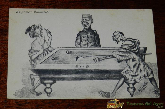 POSTAL ILUSTRADA LA PRIMERA CARAMBOLA, MULLOR, EDICION BOIX HERMANOS, MELILLA, CARICATURA MORO, HUMOR, SIN CIRCULAR.
