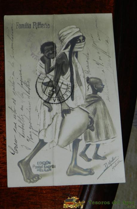 FAMILIA RIFEÑA, EDICION BOIX HERMANOS, MELILLA, CARICATURA MORO, HUMOR, CIRCULADA EN 1913.