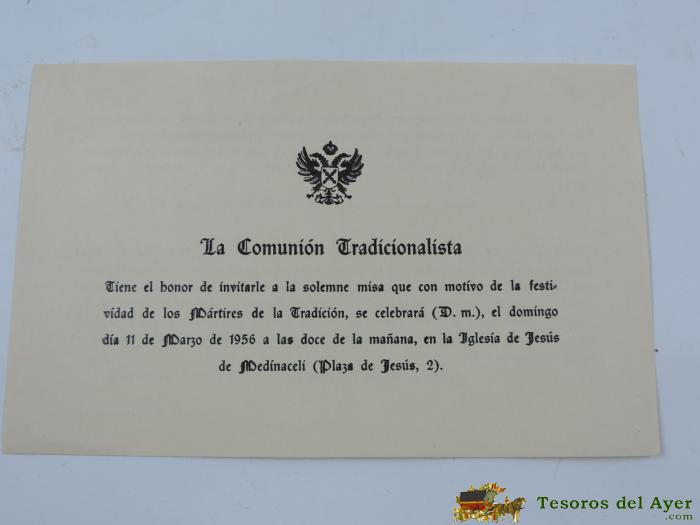 ANTIGUA INVITACION DE LA COMUNION TRADICIONALISTA, CON MOTIVO DE LA FESTIVIDAD DE LOS MARTIRES DE LA TRADICION, 10 DE MARZO DE 1955, CARLISTA, O PANFLETO, CARLISMO, REQUETE. MIDE 16,5 X 10 CMS.