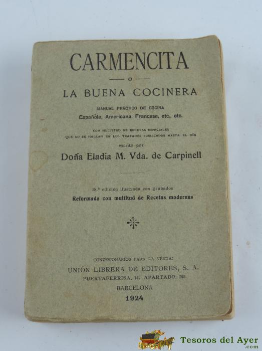 LIBRO CARMENCITA ó LA BUENA COCINERA, AÑO 1924, POR ELADIA CARPINELL, COCINA, BARCELONA, MANUAL PRáCTICO DE COCINA ESPAñOLA, AMERICANA, FRANCESA, ETC…, MIDE 15,5 X 11 CMS.