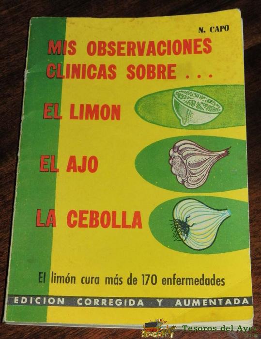 LIBRO MIS OBSERVACIONES CLINICAS SOBRE EL LIMON, EL AJO, LA CEBOLLA, POR N. CAPO, EL LIMON CURA MAS DE 170 ENFERMEDADES. EDICION CORREGIDA Y AUMENTADA. TIENE 103 PAGINAS. MIDE 19,5 X 13,5 CMS.
