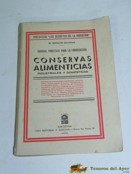 MOULIN, M. MANUAL PRáCTICO PARA LA FABRICACIóN DE CONSERVAS ALIMENTICIAS. BARCELONA. CASA EDITORIAL F. SUSANNA, 1941. TIENE 290 PAG. ILUSTRACIONES INTERCALADAS EN EL TEXTO. MIDE 22 CM. COL. BIBLIOTECA LOS SECRETOS DE LA INDUSTRIA