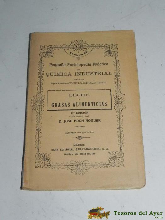 LIBRO DE LA LECHE Y GRASAS ALIMENTICIAS (PEQUEÑA ENCICLOPEDIA PRACTICA DE QUIMICA INDUSTRIAL, Nº 13). - POR POCH NOGUER, JOSE. MADRID (CA. 1920), MIDE 19 X 13 CM., TIENE 144 PAG. RUSTICA, CASA EDITORIAL BAILLY-BAILLIERE.