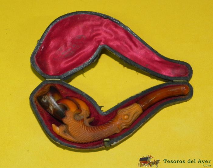 ANTIGUA PIPA DE ESPUMA DE MAR CON FORMA DE GARRA, FINALES SIGLO XIX, CON SU ESTUCHE ORIGINAL, MIDE 12 CMS. DE LARGO. TIENE DESPERFECTO EN UNA GARRA Y ESTA PEGADA LA COPA DONDE VA EN TABACO.