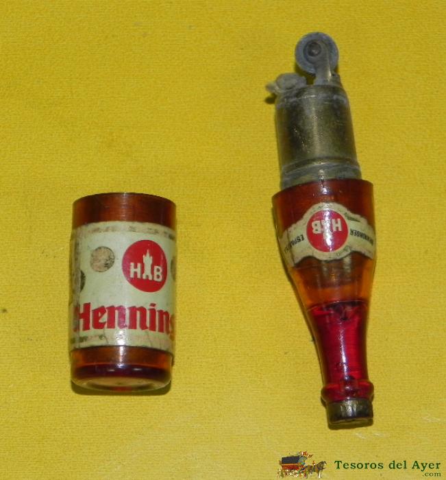 ANTIGUO MECHERO O ENCENDEDOR DE GASOLINA, CERVEZA HB HENNINGER, CON FORMA DE BOTELLA DE CERVEZA, MIDE 7 CMS.
