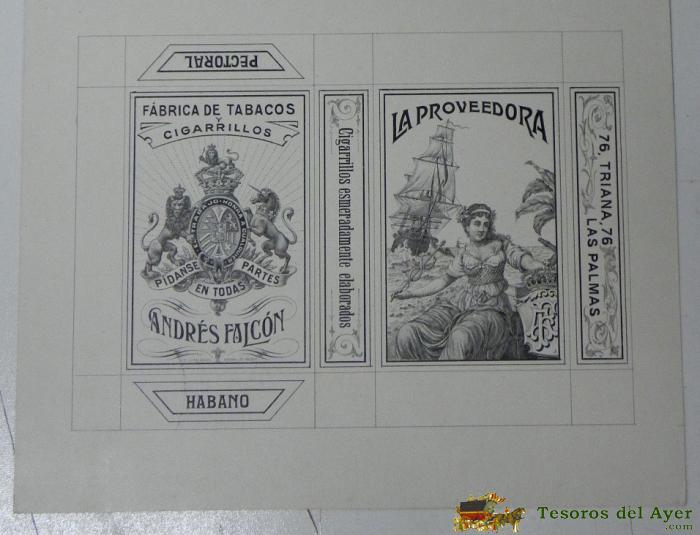 ANTIGUA LITOGRAFIA CON PUBLICIDAD DE PAQUETE DE TABACO LA PROVEEDORA, FABRICA DE CIGARRILLOS, LAS PALMAS, MIDE 17 X 13,4 CMS.