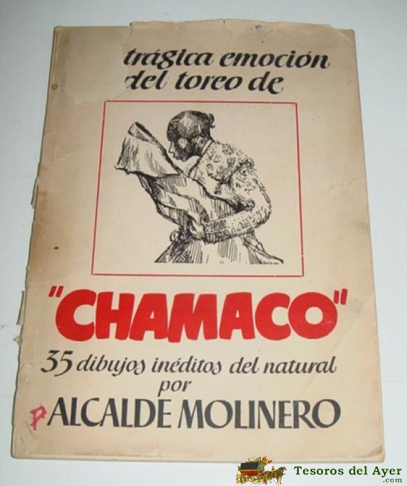 ANTIGUO LIBRO LA TRÁGICA EMOCIÓN DEL TOREO DE CHAMACO - 35 DIBUJOS INéDITOS DEL NATURAL POR ALCALDE MOLINERO - AÑO 1954 - LOMO Y PORTADA CON DESPERFECTOS - MIDE 24,5 X 17CM - TEXTO EN ESPAñOL, FRANCéS E INGLéS.