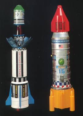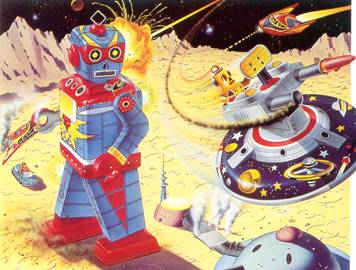 140 piezas, que componen robots , naves espaciales, tanques lunares, cápsulas, cohetes, astronautas, cascos, pistolas y lanzadores desintegradores, todas ellas de juguete, originales que datan entre 1950 y 1.970.